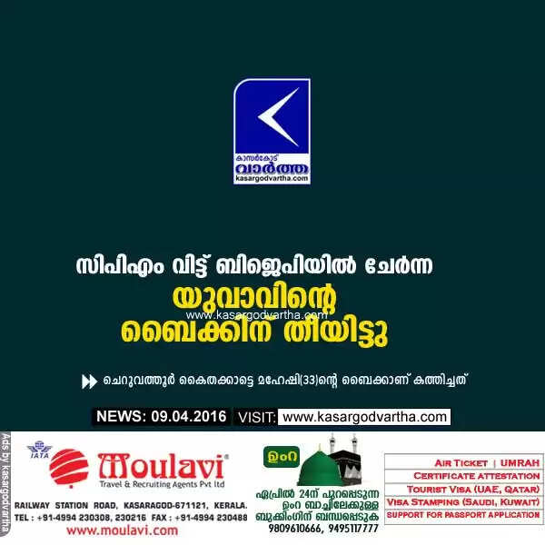 ചെറുവത്തൂര്: (www.kasargodvartha.com 09.04.2016) സിപിഎം വിട്ട് ബിജെപി യില് ചേര്ന്ന യുവാവിന്റെ ബൈക്ക് തീവെച്ച് നശിപ്പിച്ചു. ചെറുവത്തൂര് കൈതക്കാട്ടെ മഹേഷി(33)ന്റെ ബൈക്കാണ് കത്തിച്ചത്.