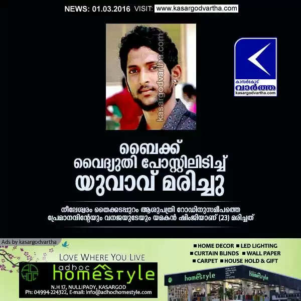 Keywords : Nileshwaram, Accident, Death, Youth, Bike, Kanhangad, Kasaragod, Electric post, Shimji.