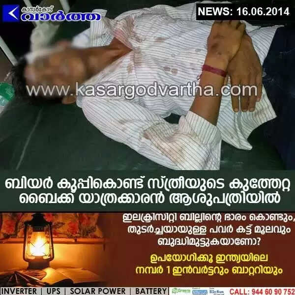 ബിയര് കുപ്പികൊണ്ട് സ്ത്രീയുടെ കുത്തേറ്റ ബൈക്ക് യാത്രക്കാരന് ആശുപത്രിയില്