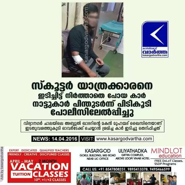 അണങ്കൂര്‍: (www.kasargodvartha.com 14/04/2016) സ്‌കൂട്ടര്‍ യാത്രക്കാരനായ യുവാവിനെ ഇടിച്ചിട്ട് നിര്‍ത്താതെ പോയ കാര്‍ നാട്ടുകാര്‍ പിന്തുടര്‍ന്ന് പിടികൂടി. വിദ്യാനഗര്‍ ചാലയിലെ അബ്ദുല്‍ ഖാദറിന്റെ മകന്‍ മുഹമ്മദ് ഖൈസിനെ (21) യാണ് ഇടതുവശത്തുകൂടി ഓവര്‍ടേക്ക് ചെയ്യാന്‍ ശ്രമിച്ച കാര്‍ ഇടിച്ചു തെറിപ്പിച്ചത്.