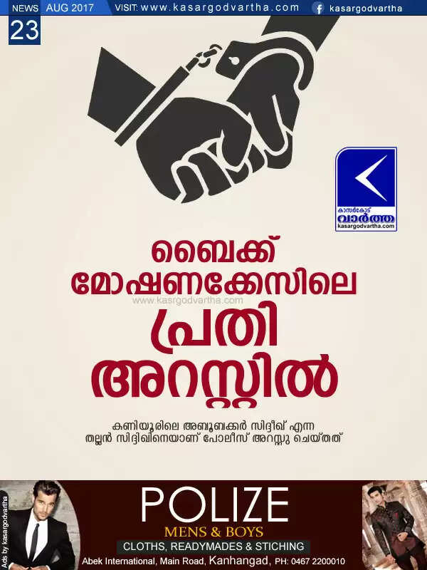 മഞ്ചേശ്വരം: (www.kasargodvartha.com 23.08.2017) ബൈക്ക് മോഷണക്കേസിലെ പ്രതിയെ പോലീസ് അറസ്റ്റു ചെയ്തു. കണിയൂരിലെ അബൂബക്കര്‍ സിദ്ദീഖ് എന്ന തല്ലന്‍ സിദ്ദിഖിനെ (19)യാണ് മഞ്ചേശ്വരം എസ്.ഐ. ഇ. അനൂപ് കുമാറിന്റെ നേതൃത്വത്തിലുള്ള പോലീസ് സംഘം അറസ്റ്റു ചെയ്തത്.