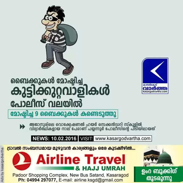 അജാനൂര്: (www.kasargodvartha.com 10/02/2016) പയ്യന്നൂരിലും പരിസരങ്ങളിലും ബൈക്ക് മോഷണം നടത്തിയ കുട്ടിക്കുറ്റവാളികള് പോലീസ് വലയിലായി. അജാനൂരിലെ വൊക്കേഷണല് ഹയര് സെക്കന്ഡറി സ്കൂളില് വിദ്യാര്ത്ഥികളായ നാല് പേരാണ് പയ്യന്നൂര് പോലീസിന്റെ പിടിയിലായത്. ഇതോടെ പയ്യന്നൂരിലും പരിസരങ്ങളിലും നടന്ന നിരവധി ബൈക്ക് മോഷണ സംഭവങ്ങളുടെ ചുരുളഴിഞ്ഞു.