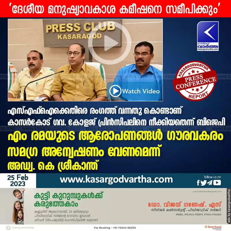 BJP | എസ്എഫ്ഐക്കെതിരെ രംഗത്ത് വന്നതു കൊണ്ടാണ് കാസര്കോട് ഗവ. കോളജ് പ്രിന്സിപലിനെ നീക്കിയതെന്ന് ബിജെപി; എം രമയുടെ ആരോപണങ്ങൾ ഗൗരവകരം, സമഗ്ര അന്വേഷണം വേണമെന്ന് അഡ്വ. കെ ശ്രീകാന്ത്; 'ദേശീയ മനുഷ്യാവകാശ കമീഷനെ സമീപിക്കും'