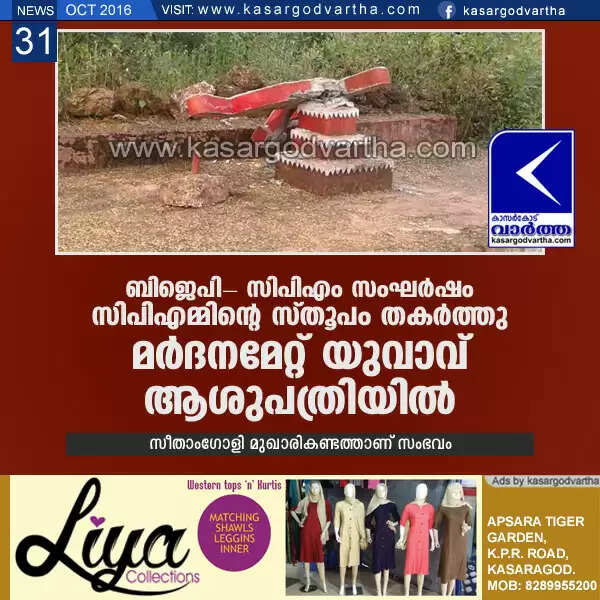 ബിജെപി- സിപിഎം സംഘര്ഷം; സിപിഎമ്മിന്റെ സ്തൂപം തകര്ത്തു, മര്ദനമേറ്റ് യുവാവ് ആശുപത്രിയില്