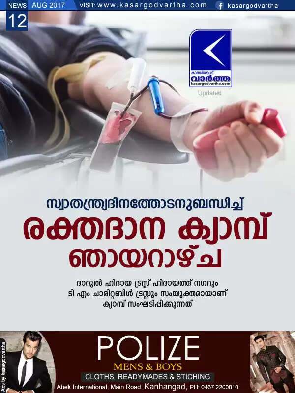 സ്വാതന്ത്ര്യ ദിനാഘോഷത്തിന്റെ ഭാഗമായി നടക്കുന്ന രക്തദാന ക്യാമ്പിലേക്ക് നല്ലവരായ ജനങ്ങളുടെ പൂര്ണ സഹകരണം ഉണ്ടാകണമെന്ന് ദാറുല് ഹിദായ ട്രസ്റ്റും ടി എം ചാരിറ്റബിള് ട്രസ്റ്റും സംയുക്ത വാര്ത്താകുറിപ്പില് അറിയിച്ചു.