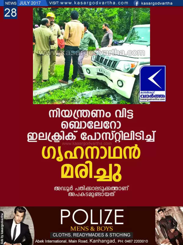 Keywords: Kasaragod, Kerala, news, Adoor, Death, Accidental-Death, Bolero hits electric post; driver dies
