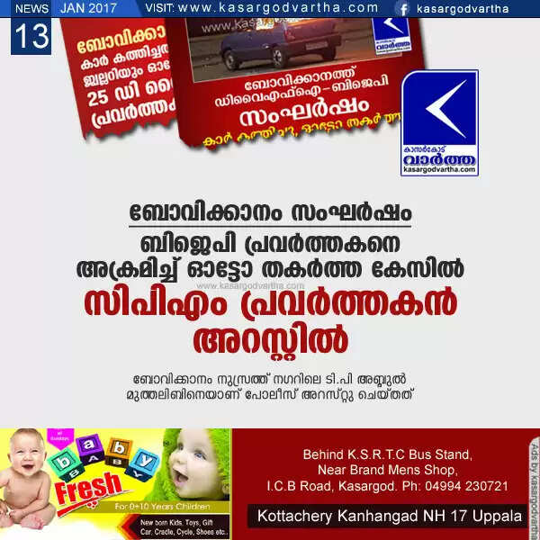 Keywords: Kasaragod, Kerala, Auto-rickshaw, BJP, Attack, Assault, Bovikanam, case, Police, complaint, arrest, CPM, Bovikanam clash; CPM activist arrested.