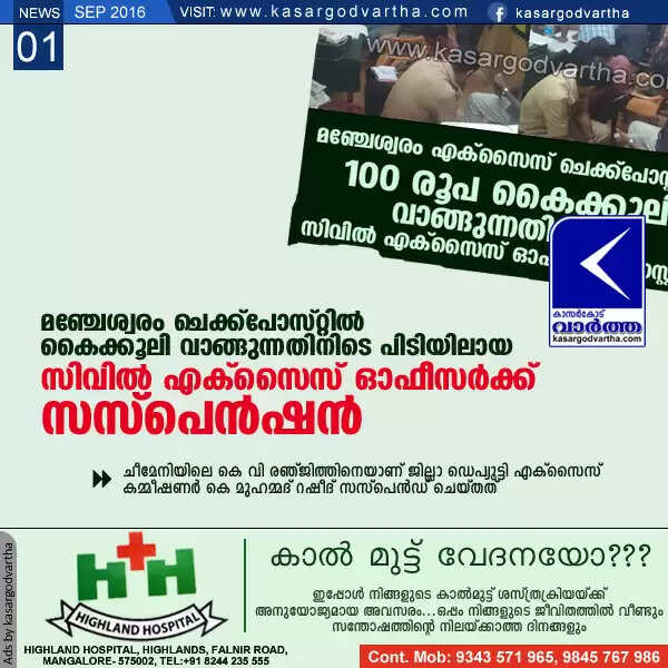 Keywords : Kasaragod, Manjeshwaram, Check-post, Suspension, Investigation, KV Ranjith, Civil Excise Officer, Bribe: Civil Excise Officer suspended.