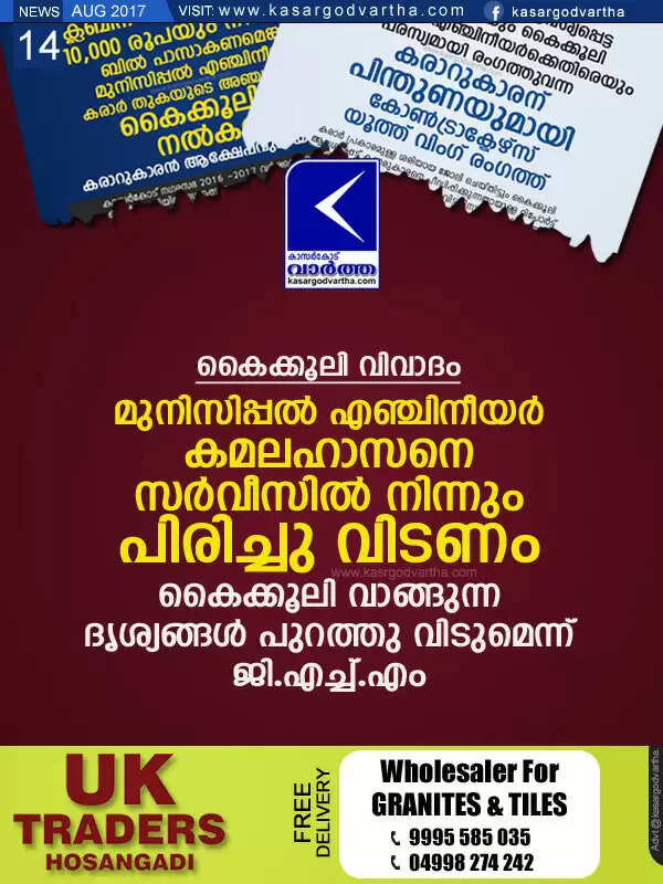 കൈക്കൂലി വിവാദം; മുനിസിപ്പല്‍ എഞ്ചിനീയര്‍ കമലഹാസനെ സര്‍വീസില്‍ നിന്നും പിരിച്ചു വിടണം, കൈക്കൂലി വാങ്ങുന്ന ദൃശ്യങ്ങള്‍ പുറത്തു വിടുമെന്ന് ജി.എച്ച്.എം