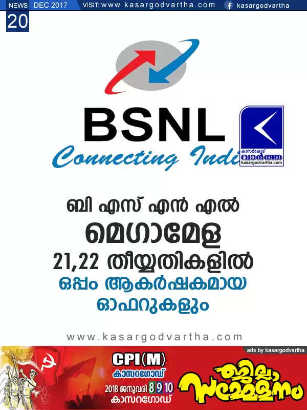 Keywords: Kasaragod, Kerala, News, BSNL, Sim card, Data, Mobile Aadhar linking, Offers, BSNL Mega fair on 21,22.