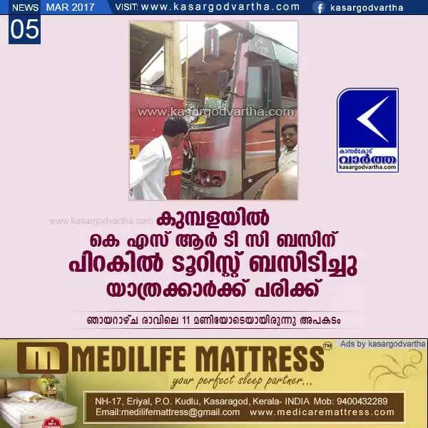 കുമ്പളയില്‍ കെ എസ് ആര്‍ ടി സി ബസിന് പിറകില്‍ ടൂറിസ്റ്റ് ബസിടിച്ചു; യാത്രക്കാര്‍ക്ക് പരിക്ക്