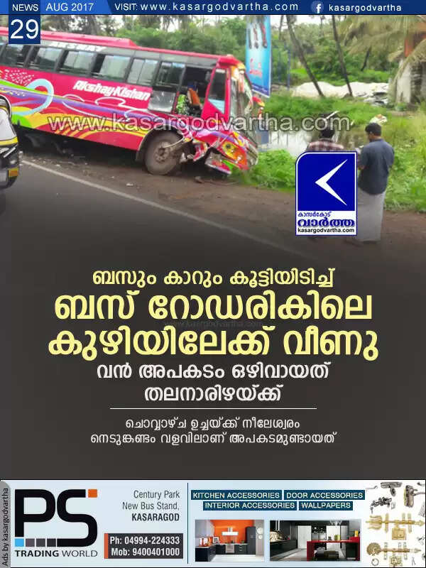 നീലേശ്വരം: (www.kasargodvartha.com 29.08.2017) ബസും കാറും കൂട്ടിയിടിച്ച് ബസ് റോഡരികിലെ കുഴിയിലേക്ക് വീണു. വന് അപകടം ഒഴിവായത് തലനാരിഴയ്ക്ക്. ചൊവ്വാഴ്ച ഉച്ചയ്ക്ക് രണ്ടു മണിയോടെ നീലേശ്വരം നെടുങ്കണ്ടം വളവിലാണ് അപകടമുണ്ടായത്. കാഞ്ഞങ്ങാട് നിന്നും നീലേശ്വരം ഭാഗത്തേക്ക് പോവുകയായിരുന്ന ബസും എതിരെ നിന്നും വരികയായിരുന്ന കാറും കൂട്ടിയിടിക്കുകയായിരുന്നു.