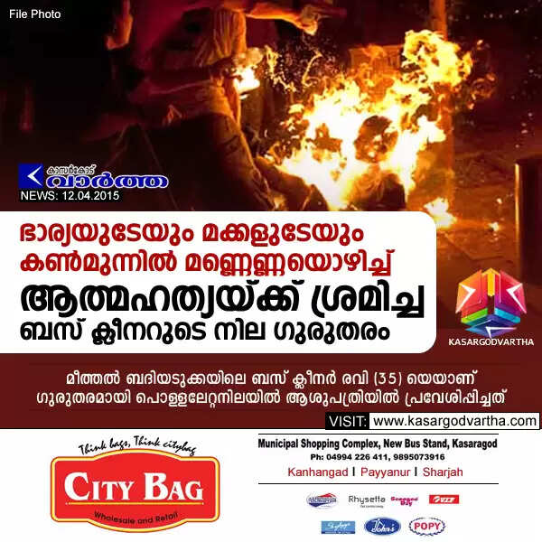 ഭാര്യയുടേയും മക്കളുടേയും കണ്മുന്നില് മണ്ണെണ്ണയൊഴിച്ച് ആത്മഹത്യയ്ക്ക് ശ്രമിച്ച ബസ് ക്ലീനറുടെ നില ഗുരുതരം