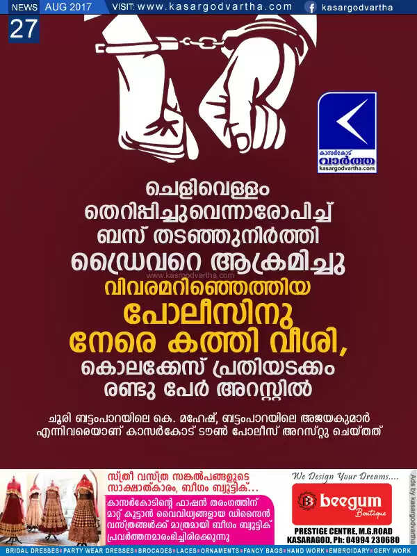 ചെളിവെള്ളം തെറിപ്പിച്ചുവെന്നാരോപിച്ച് ബസ് തടഞ്ഞുനിര്ത്തി ഡ്രൈവറെ ആക്രമിച്ചു; വിവരമറിഞ്ഞെത്തിയ പോലീസിനു നേരെ കത്തി വീശി, കൊലക്കേസ് പ്രതിയടക്കം രണ്ടു പേര് അറസ്റ്റില്
