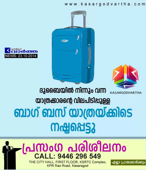 കാസര്കോട്: (www.kasargodvartha.com 23.10.2014) ദുബൈയില് നിന്നും വന്ന യാത്രക്കാരന്റെ വിലപിടിപ്പുള്ള ബാഗും മറ്റു വസ്തുക്കളും ബസ് യാത്രയ്ക്കിടെ നഷ്ടപ്പെട്ടതായി പരാതി. ഉദുമ ബാരയിലെ മുഹമ്മദ് കുഞ്ഞിയുടെ ബാഗാണ് മുംബൈയില് നിന്നും കാസര്കോട്ടേക്കുള്ള ബസ് യാത്രയ്ക്കിടെ നഷ്ടപ്പെട്ടത്.