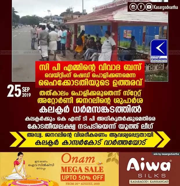 സി പി എമ്മിന്റെ വിവാദ ബസ് വെയ്റ്റിംഗ് ഷെഡ് പൊളിക്കണമെന്ന ഹൈക്കോടതിയുടെ ഉത്തരവ്: തത്കാലം പൊളിക്കരുതെന്ന് സ്റ്റേറ്റ് അറ്റോര്ണി ജനറലിന്റെ ശുപാര്ശ, കലക്ടര് ധര്മസങ്കടത്തില്, കലക്ടര്ക്കും കെ എസ് ടി പി അധികൃതര്ക്കുമെതിരെ കോടതീയലക്ഷ്യ നടപടിയെന്ന് യൂത്ത് ലീഗ്, അഡ്വ. ജനറലിന്റെ വിശദീകരണം ആവശ്യപ്പെട്ടതായി കലക്ടര് കാസര്കോട് വാര്ത്തയോട്