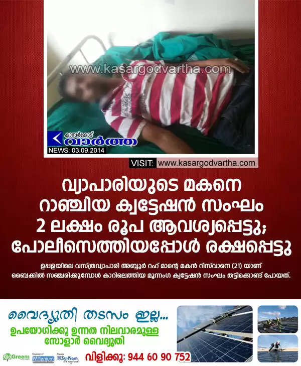 ഉപ്പള: (www.kasargodvartha.com 13.09.2014) വ്യാപാരിയുട മകനെ റാഞ്ചിക്കൊണ്ട് പോയി രണ്ട് ലക്ഷം രൂപ മോചനദ്രവ്യം ആവശ്യപ്പെട്ട മൂന്നംഗ ക്വട്ടേഷന്‍  സംഘം പോലീസ് പിടിയിലാകുമെന്ന ഘട്ടമെത്തിയപ്പോള്‍ യുവാവിനെ ഉപേക്ഷിച്ച് രക്ഷപ്പെട്ടു. ഉപ്പളയിലെ വസ്ത്രവ്യാപാരി അബ്ദുര്‍ റഹ് മാന്റെ മകന്‍ റിസ്‌വാനെ (21) യാണ് ബൈക്കില്‍ സഞ്ചരിക്കുമ്പോള്‍ കാറിലെത്തിയ മൂന്നംഗ ക്വട്ടേഷന്‍ സംഘം തട്ടിക്കൊണ്ട് പോയത്.