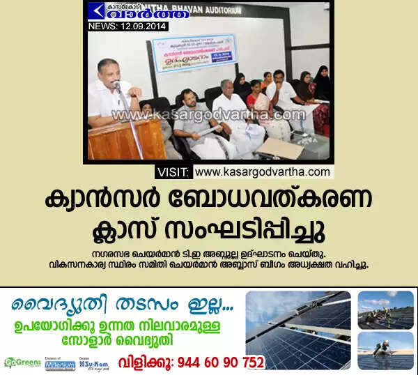 Keywords: Kasaragod, Kerala, Class, Inauguration, Speak, Cancer, Function, Chairman, T.E Abdulla, Cancer awareness class conducted.