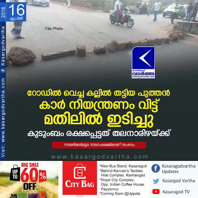 Keywords: Kasaragod, Kerala, News, Car-Accident, Road, Wall Collapsed, Stuck On The Stone, Car accident; Family Escaped. < !- START disable copy paste -->