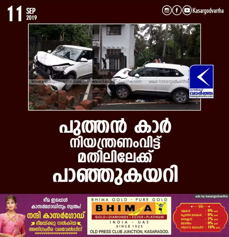 പുത്തന് കാര് നിയന്ത്രണംവിട്ട് മതിലിലേക്ക് പാഞ്ഞുകയറി
