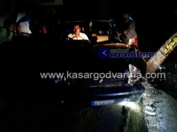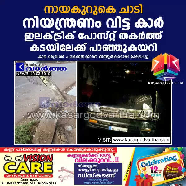 കാസര്‍കോട്: (www.kasargodvartha.com 16/03/2015) നായകുറുകെ ചാടിയതിനെ തുടര്‍ന്ന് നിയന്ത്രണം വിട്ട കാര്‍ ഇലക്ട്രിക് പോസ്റ്റ് ഇടിച്ചു തകര്‍ത്ത് കടയിലേക്ക് പാഞ്ഞുകയറി. കാര്‍ ഡ്രൈവര്‍ പരിക്കേല്‍ക്കാതെ അത്ഭുതകരമായി രക്ഷപ്പെട്ടു. തിങ്കളാഴ്ച പുലര്‍ച്ചെ 1.30 മണിയോടെ എം.ജി റോഡില്‍ മുസ്ലിം ലീഗ് ജില്ലാ കമ്മിറ്റി ഓഫീസിന് മുന്നിലാണ് അപകടമുണ്ടായത്.