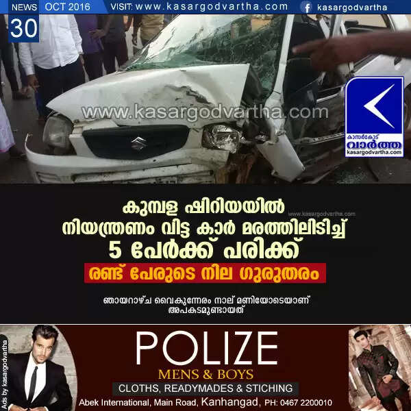 കുമ്പള ഷിറിയയില്‍ നിയന്ത്രണം വിട്ട കാര്‍ മരത്തിലിടിച്ച് 5 പേര്‍ക്ക് പരിക്ക്; രണ്ട് പേരുടെ നില ഗുരുതരം