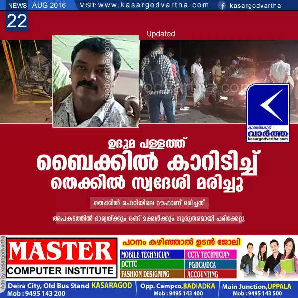 Keywords : Udma, Kasaragod, Accident, Death, Hospital, Bike, Car, Injured, Pallam.