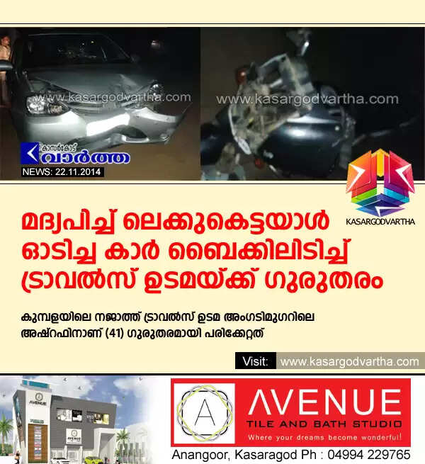കുമ്പള: (www.kasargodvartha.com 22.11.2014) മദ്യപിച്ച് ലെക്കുകെട്ടയാള് ഓടിച്ച കാര് ബൈക്കിലിടിച്ച് ട്രാവല്സ് ഉടമയ്ക്ക് ഗുരുതരമായി പരിക്കേറ്റു. കുമ്പളയിലെ നജാത്ത് ട്രാവല്സ് ഉടമ അംഗടിമുഗറിലെ അഷ്റഫിനാണ് (41) ഗുരുതരമായി പരിക്കേറ്റത്. വെള്ളിയാഴ്ച രാത്രി ഒമ്പത് മണിയോടെ ട്രാവല്സ് അടച്ച് വീട്ടിലേക്ക് ബൈക്കില് പോവുകയായിരുന്ന അഷ്റഫിന്റെ ബൈക്കില് മദ്യപിച്ച് ലെക്കുകെട്ടയാള് ഓടിച്ച കാറിടിക്കുകയായിരുന്നു.