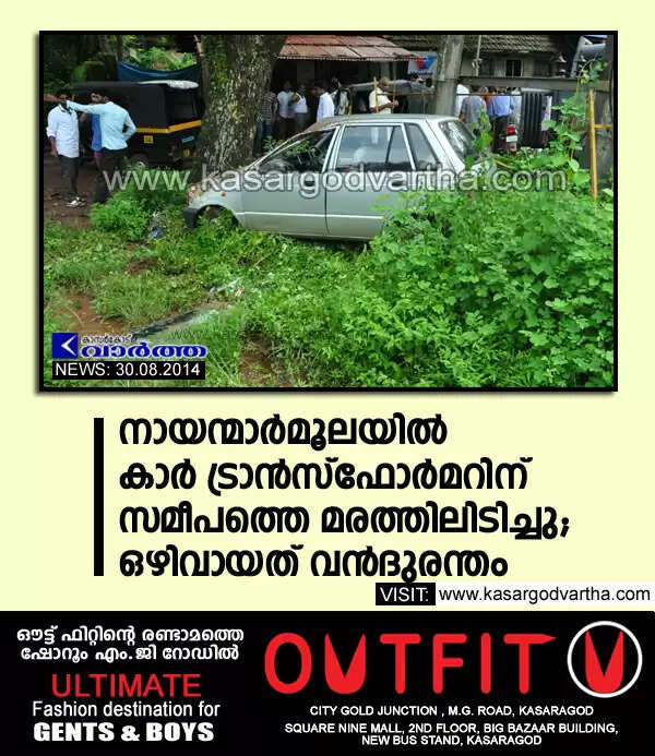 നായന്മാര്മൂലയില് കാര് ട്രാന്സ്ഫോര്മറിന് സമീപത്തെ മരത്തിലിടിച്ചു; ഒഴിവായത് വന്ദുരന്തം