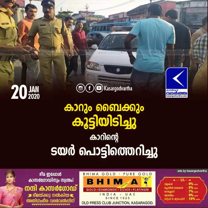 കാറ് മാവുങ്കാല് ഭാഗത്തേക്ക് പോകാനായി വളച്ചപ്പോള് ബൈക്കിടിക്കുകയായിരുന്നു. ഇടിയുടെ ആഘാതത്തില് ബൈക്ക് യാത്രക്കാരന് തെറിച്ചുവീഴുകയും കാറിന്റെ മുന്നിലെ ടയര് പൊട്ടിത്തെറിക്കുകയുമായിരുന്നു. യാത്രക്കാര് നിസാര പരിക്കുകളോടെ രക്ഷപ്പെട്ടു.