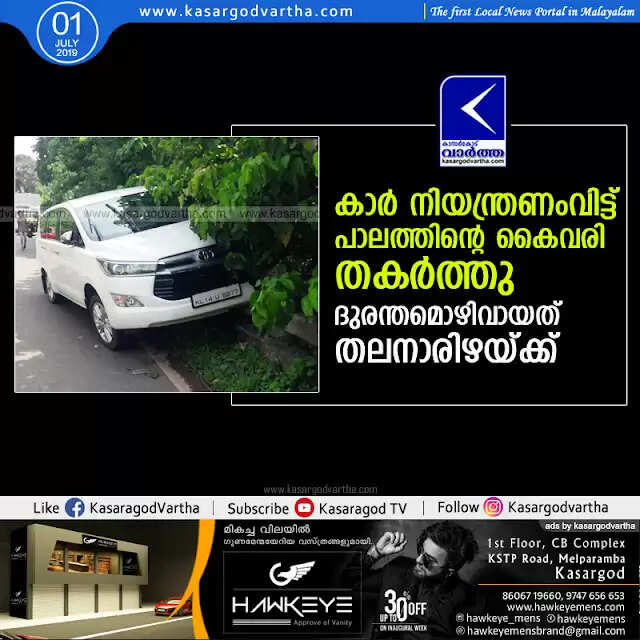 കാര് നിയന്ത്രണംവിട്ട് പാലത്തിന്റെ കൈവരി തകര്ത്തു; ദുരന്തമൊഴിവായത് തലനാരിഴയ്ക്ക്