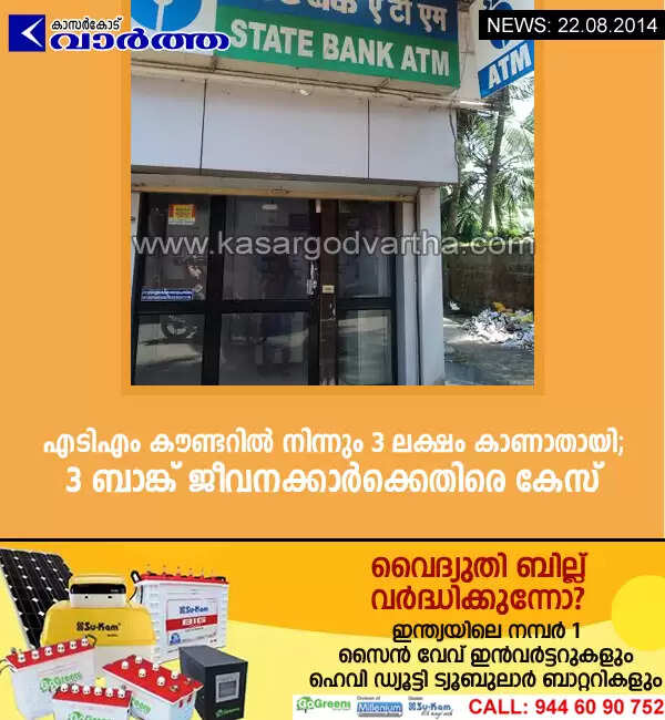 എടിഎം കൗണ്ടറില് നിന്നും 3 ലക്ഷം കാണാതായി; 3 ബാങ്ക് ജീവനക്കാര്ക്കെതിരെ കേസ്