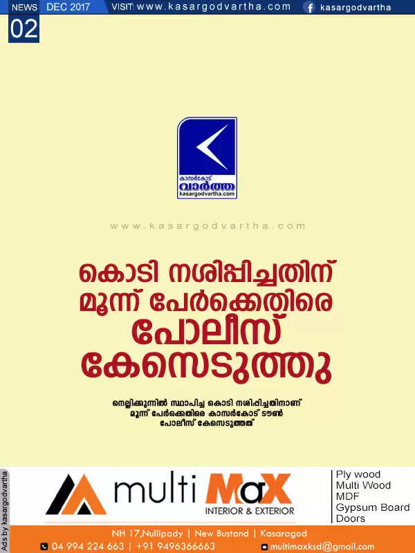 Keywords: Kasaragod, Kerala, News, Flag, Police, Case, Custody, Investigation, Case against 3 for demolishing flag.