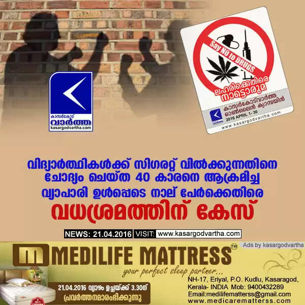 കടയില് വിദ്യാര്ത്ഥികള്ക്ക് സിഗരറ്റ് വില്ക്കുന്നതിനെ ചോദ്യം ചെയ്ത 40 കാരനെ ആക്രമിച്ച വ്യാപാരി ഉള്പ്പെടെ നാല് പേര്ക്കെതിരെ വധശ്രമത്തിന് കേസ്