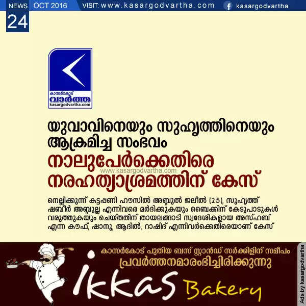 കാസര്കോട്: (www.kasargodvartha.com 24/10/2016) യുവാവിനെയും സുഹൃത്തിനെയും ബൈക്ക് തടഞ്ഞ് ആക്രമിച്ച സംഭവത്തില് നാലു പേര്ക്കെതിരെ കാസര്കോട് ടൗണ് പോലീസ് നരഹത്യാശ്രമത്തിന് കേസെടുത്തു.