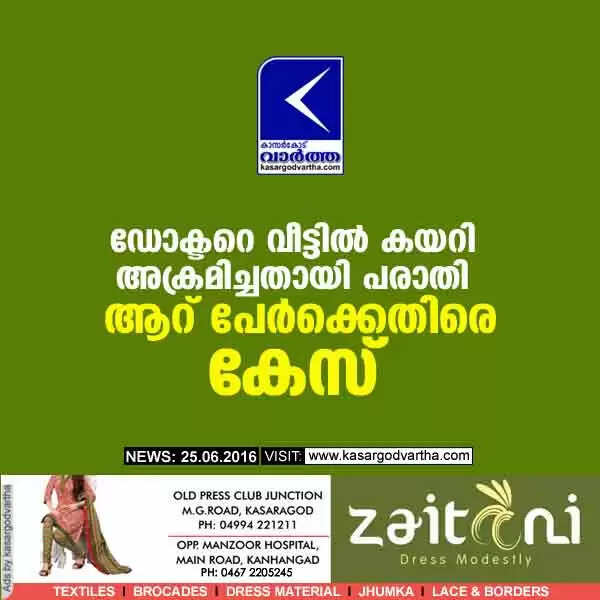 ഡോക്ടറെ വീട്ടില് കയറി അക്രമിച്ചതായി പരാതി; ആറ് പേര്ക്കെതിരെ കേസ്