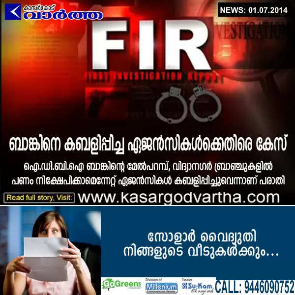 Keywords: Kasaragod, Case, Bank, Cheating, Cash, Complaint, Police, Melparamba, Vidya Nagar, Agency, Branch.