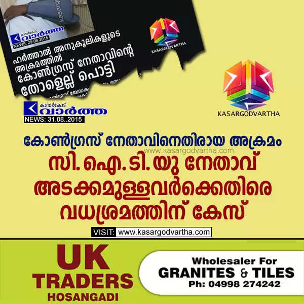 പൊയിനാച്ചി: (www.kasargodvartha.com 31/08/2015) ഹര്‍ത്താല്‍ ദിനത്തില്‍ കോണ്‍ഗ്രസ് നേതാവിനെ ബൈക്ക് തടഞ്ഞ് അക്രമിച്ച് ഗുരുതരമായി പരിക്കേല്‍പിച്ച സംഭവത്തില്‍ സി.ഐ.ടി.യു. നേതാവടക്കം അഞ്ചോളം സി.പി.എം. പ്രവര്‍ത്തകര്‍ക്കെതിരെ പോലീസ് വധശ്രമത്തിന് കേസെടുത്തു. കോണ്‍ഗ്രസ് ബേഡകം മണ്ഡലം ജനറല്‍ സെക്രട്ടറിയും കണ്‍സ്ട്രക്ഷന്‍ വര്‍ക്കേഴ്‌സ് വെല്‍ഫയര്‍ അസോസിയേഷന്‍ (ഐ.എന്‍.ടി.യു.സി.) ജില്ലാ പ്രസിഡന്റുമായ മജീദ് കുറ്റിക്കോലിനെ (37) ആക്രമിച്ച സംഭവത്തില്‍ സി.ഐ.ടി.യു നേതാവ് പ്രശാന്ത് കരിച്ചേരി, ലോക്കല്‍ കമ്മിറ്റി അംഗം ജനാര്‍ദനന്‍, ദിവാകരന്‍ എയ്യള, ശരത്ത് കുട്ട്യാനം, എസ്.എഫ്.ഐ. പ്രവര്‍ത്തകനായ ശരത്ത് എന്നിവര്‍ക്കെതിരെയാണ് ബേഡകം പോലീസ് കേസെടുത്തത്.