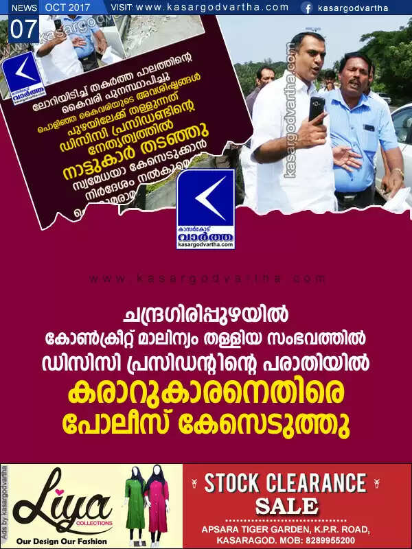 ചന്ദ്രഗിരിപ്പുഴയില് കോണ്ക്രീറ്റ് മാലിന്യം തള്ളിയ സംഭവത്തില് ഡിസിസി പ്രസിഡന്റിന്റെ പരാതിയില് കരാറുകാരനെതിരെ പോലീസ് കേസെടുത്തു