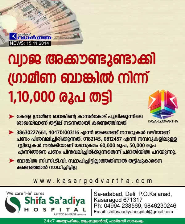 കാസര്കോട്: (www.kasargodvartha.com 15.11.2014) വ്യാജ അക്കൗണ്ടുണ്ടാക്കി കേരള ഗ്രാമീണ ബാങ്കില് നിന്ന് രണ്ട് തവണയായി 1,10,000 രൂപ തട്ടിയെടുത്തതായി കണ്ടെത്തി. കേരള ഗ്രാമീണ ബാങ്കിന്റെ കാസര്കോട് പുലിക്കുന്നിലെ ശാഖയിലാണ് തട്ടിപ്പ് നടന്നതായി കണ്ടെത്തിയത്.