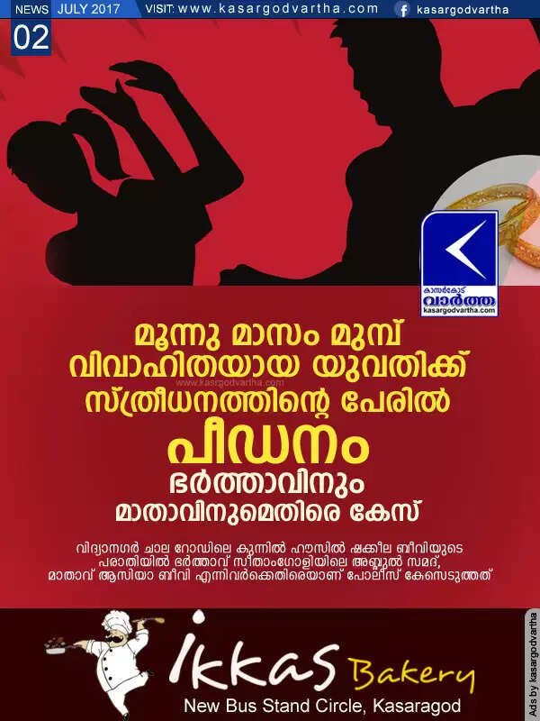 മൂന്നു മാസം മുമ്പ് വിവാഹിതയായ യുവതിക്ക് സ്ത്രീധനത്തിന്റെ പേരില് പീഡനം; ഭര്ത്താവിനും മാതാവിനുമെതിരെ കേസ്