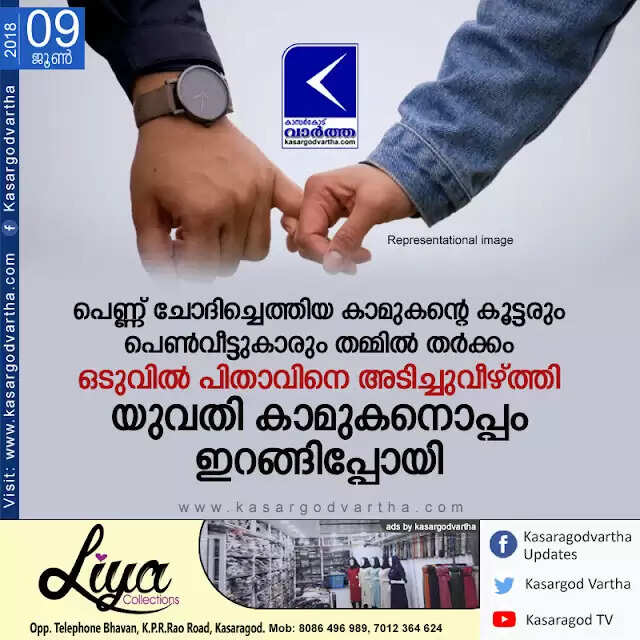 രാജപുരം: (www.kasargodvartha.com 09.06.2018) കാമുകിയെ പെണ്ണ് ചോദിച്ച് ചെന്ന കാമുകനും ബന്ധുക്കളും പിതാവിനെ അടിച്ചുവീഴ്ത്തി. കാമുകി വീടിന്റെ പിന്നാമ്പുറത്തുകൂടെ കാമുകന്റെ കൂടെ ഇറങ്ങിപ്പോയി. വിവാഹിതയായി. പിതാവിന്റെ പരാതിയില്‍ കാമുകനും ബന്ധുക്കള്‍ക്കുമെതിരെ പോലീസ് കേസെടുത്തു.