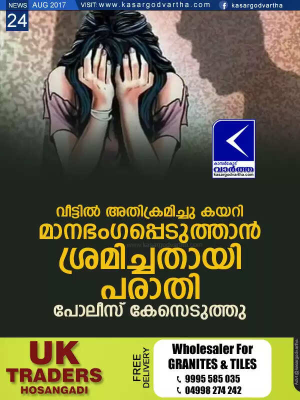 ബദിയടുക്ക: (www.kasargodvartha.com 24.08.2017) വീട്ടില്‍ അതിക്രമിച്ചു കയറി മാനഭംഗപ്പെടുത്താന്‍ ശ്രമിച്ചതായി പരാതി. സംഭവത്തില്‍ യുവാവിനെതിരെ പോലീസ് കേസെടുത്തു. ബദിയടുക്ക പുണ്ടൂരിന് സമീപം വാടക ക്വാര്‍ട്ടേഴ്സില്‍ താമസിക്കുന്ന 32 കാരിയുടെ പരാതിയില്‍ കര്‍ണാടക കുസതിഗെയിലെ കേശവ മല്ലികാര്‍ജ്ജുന (22) ക്കെതിരെയാണ് പോലീസ് കേസെടുത്തത്.