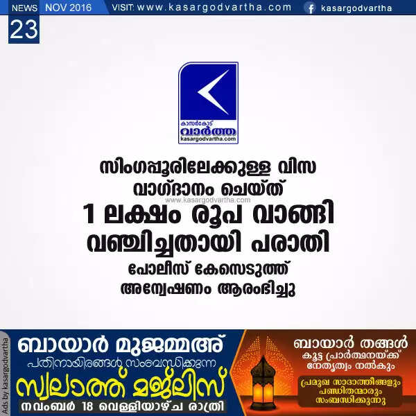 സിംഗപ്പൂരിലേക്കുള്ള വിസ വാഗ്ദാനം ചെയ്ത് 1 ലക്ഷം രൂപ വാങ്ങി വഞ്ചിച്ചതായി പരാതി; പോലീസ് കേസെടുത്ത് അന്വേഷണം ആരംഭിച്ചു