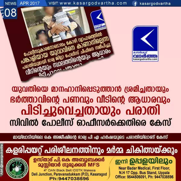 യുവതിയെ മാനഹാനിപ്പെടുത്താന് ശ്രമിച്ചതായും ഭര്ത്താവിന്റെ പണവും വീടിന്റെ ആധാരവും പിടിച്ചുവെച്ചതായും പരാതി; സിവില് പോലീസ് ഓഫീസര്ക്കെതിരെ കേസ്