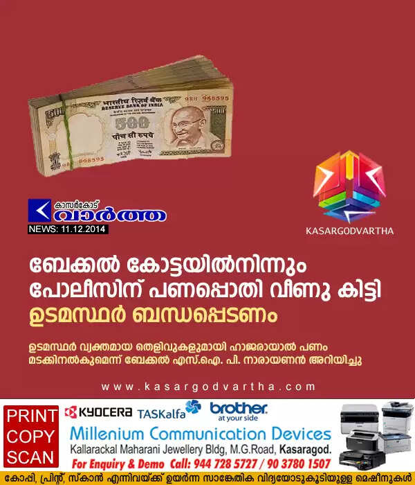 പണപ്പൊതി പോലീസുകാര്‍ ബേക്കല്‍ പോലീസ് സ്‌റ്റേഷനില്‍ ഏല്‍പിച്ചിരിക്കുകയാണ്. ഉടമസ്ഥര്‍ വ്യക്തമായ തെളിവുകളുമായി ഹാജരായാല്‍ പണം മടക്കിനല്‍കുമെന്ന് ബേക്കല്‍ എസ്.ഐ. പി. നാരായണന്‍ അറിയിച്ചു.