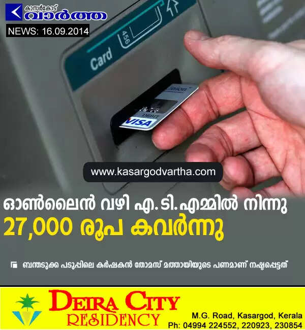 ഓണ്‍ലൈന്‍ വഴി എ.ടി.എമ്മില്‍ നിന്നു 27,000 രൂപ കവര്‍ന്നു, കേസ്