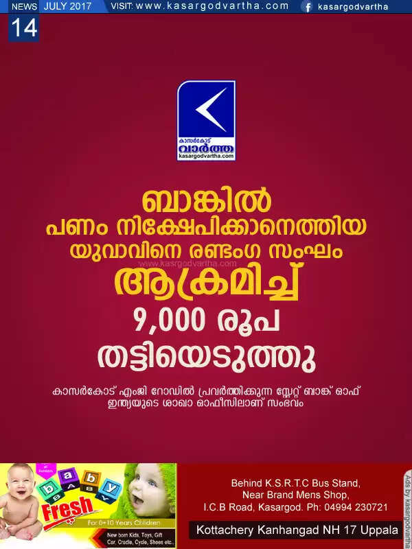 Keywords: Kasaragod, Bank, Bash, Youth, Assault, Police, Complaint, News, Police Station, Karnataka, Cash looted from youth.