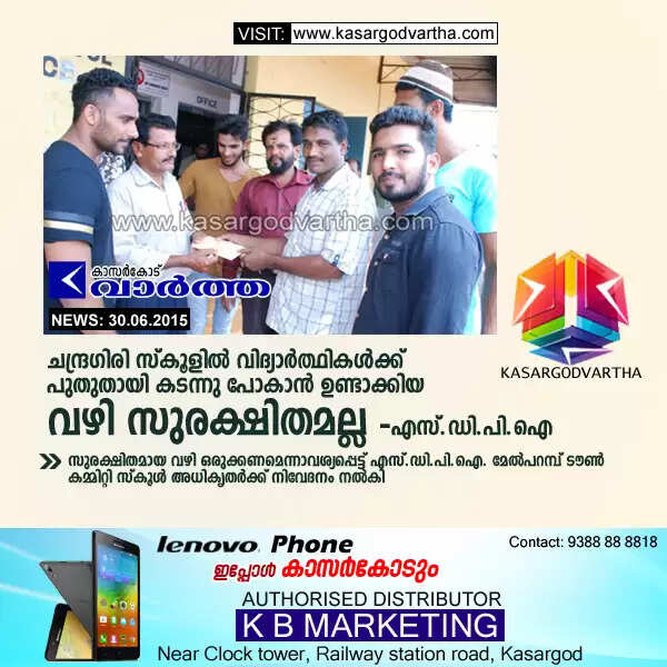 മേല്പറമ്പ്: (www.kasargodvartha.com 30/06/2015) ജി.എച്ച്.എസ്.എസ് ചന്ദ്രഗിരി സ്കൂളില് വിദ്യാര്ത്ഥികള്ക്ക് പുതുതായി കടന്നുപോകാന് ഉണ്ടാക്കിയ വഴി സുരക്ഷിതമല്ലെന്നും, അത് കൂടുതല് അപകടം വരുത്തുമെന്നും കാണിച്ചു എസ്.ഡി.പി.ഐ. മേല്പറമ്പ് ടൗണ് കമ്മിറ്റി സ്കൂള് അധികൃതര്ക്ക് നിവേദനം നല്കി.