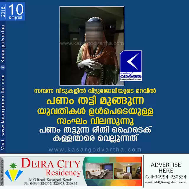 കാസര്കോട്: (www.kasargodvartha.com 10.01.2018) സമ്പന്ന വീടുകളില് എത്തി വീട്ടുജോലിയുടെ മറവില് പണം തട്ടി മുങ്ങുന്ന യുവതികള് ഉള്പെടെയുള്ള സംഘം സജീവമാകുന്നു. കണ്ണൂര്- കാസര്കോട് ജില്ലകളിലാണ് തട്ടിപ്പ് സംഘം വിലസുന്നത്. സമ്പന്ന കുടുംബങ്ങള് താമസിക്കുന്ന വീടുകളാണ് ഇവര് പ്രധാനമായും ലക്ഷ്യം വെക്കുന്നത്. കഴിഞ്ഞദിവസം കാസര്കോട് തളങ്കരയിലെ ഒരു വീട്ടില് സമാനമായ തട്ടിപ്പ് അരങ്ങേറിയതോടെയാണ് സംഘത്തെ കുറിച്ചുള്ള വിവരം പുറത്തുവന്നത്.